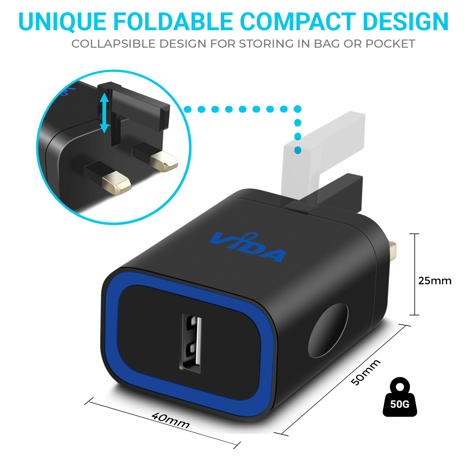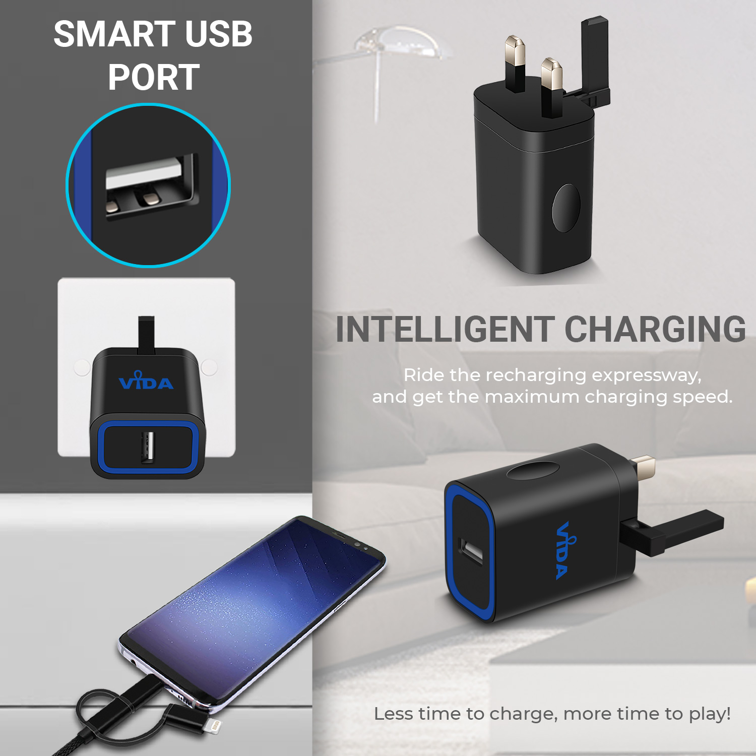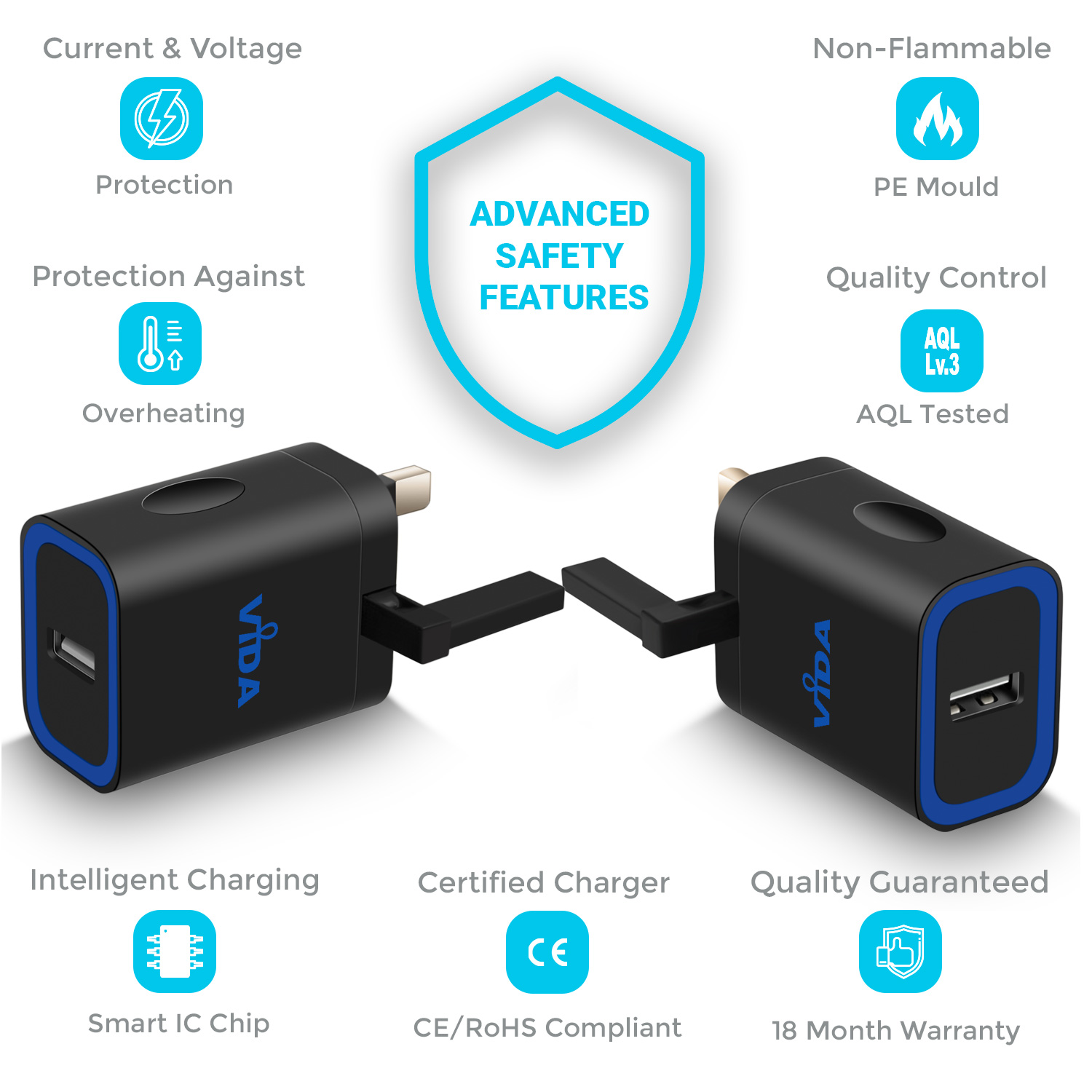[vc_row][vc_column][vc_single_image image="1330" img_size="large" alignment="center" responsive_js_composer_custom_id="responsive_js_composer_custom_css_812960945"][vc_empty_space responsive_js_composer_custom_id="responsive_js_composer_custom_css_168740507"][vc_empty_space responsive_js_composer_custom_id="responsive_js_composer_custom_css_201195951"][vc_separator responsive_js_composer_custom_id="responsive_js_composer_custom_css_405938737"][/vc_column][/vc_row][vc_row][vc_column][vc_empty_space responsive_js_composer_custom_id="responsive_js_composer_custom_css_1488369807"][cize_title style="style-01" title="Vida IT VS1 Fast 2.4 USB Charger - Upgraded Version" desc="The VS1 is the perfect charger for all your devices. The 12 watts through the 2.4A port lets you charge your phone and tablet or other devices that are USB-compatible. Complete with a high quality 3-in-1 universal nylon braided cable to charge all device types such as iPhone, iPad, Android Phones and Tablet PCs" title_custom_id="cize_custom_css_773155003" responsive_js_composer_custom_id="responsive_js_composer_custom_css_1913516465"][vc_empty_space responsive_js_composer_custom_id="responsive_js_composer_custom_css_1914669441"][cize_title style="style-01" title="Intelligent Charging for your Mobile Phone" desc="The Vida IT VS1 2.4A USB UK Wall Charger features a smart integrated circuit which identifies the current and the voltage of your device so that it can charge it at the fastest speed safely. Ride the recharging expressway and get the maximum charging speed. Less time to charge, more time to play!" title_custom_id="cize_custom_css_518951480" responsive_js_composer_custom_id="responsive_js_composer_custom_css_1406368799"][vc_empty_space responsive_js_composer_custom_id="responsive_js_composer_custom_css_1866655366"][cize_title style="style-01" title="Unique Compact Design and Build" desc="The design is also unique as compared to other chargers in the market. The Vida IT VS1 2.4A USB UK Wall Charger has a unique foldable third pin which allows users to enjoy a compact storage. If you travel a lot and would like to carry your charger along, this charger is small enough to fit into a small bag or pocket. The foldability of the pin means it won’t break easily as compared to your conventional charger. So it is an ideal charger for family or travel use." title_custom_id="cize_custom_css_1088321706" responsive_js_composer_custom_id="responsive_js_composer_custom_css_2135854236"][vc_empty_space responsive_js_composer_custom_id="responsive_js_composer_custom_css_1862433797"][cize_title style="style-01" title="Quality" desc="The quality of the Vida IT VS1 2.4A USB UK Wall Charger with Smart IC 5V couldn’t get any better. You get a high quality 21 AWG USB charging cable which has Micro USB, iPhone and USB-C adapters attached. This means you only need to carry one cable for all devices. All Vida IT chargers are AQL tested to ensure the highest quality. It comes with an 18-Month limited warranty so you can be secure with aftersales support." title_custom_id="cize_custom_css_692408880" responsive_js_composer_custom_id="responsive_js_composer_custom_css_1803039896"][vc_empty_space responsive_js_composer_custom_id="responsive_js_composer_custom_css_1728249714"][cize_title style="style-01" title="Package Contents" desc="1 x VS1 2.4A USB Wall Charger UK Plug, 1 x USB 3-in-1 Cable (Micro USB, iPhone & USB-C Adapters), 1 x User Manual" title_custom_id="cize_custom_css_2123280054" responsive_js_composer_custom_id="responsive_js_composer_custom_css_38842944"][vc_empty_space responsive_js_composer_custom_id="responsive_js_composer_custom_css_957738942"][/vc_column][vc_column][vc_empty_space responsive_js_composer_custom_id="responsive_js_composer_custom_css_402976912"][vc_separator responsive_js_composer_custom_id="responsive_js_composer_custom_css_376810385"][/vc_column][/vc_row][vc_row full_height="yes" content_placement="middle" responsive_js_composer_custom_id="responsive_js_composer_custom_css_245891328"][vc_column][/vc_column][/vc_row]