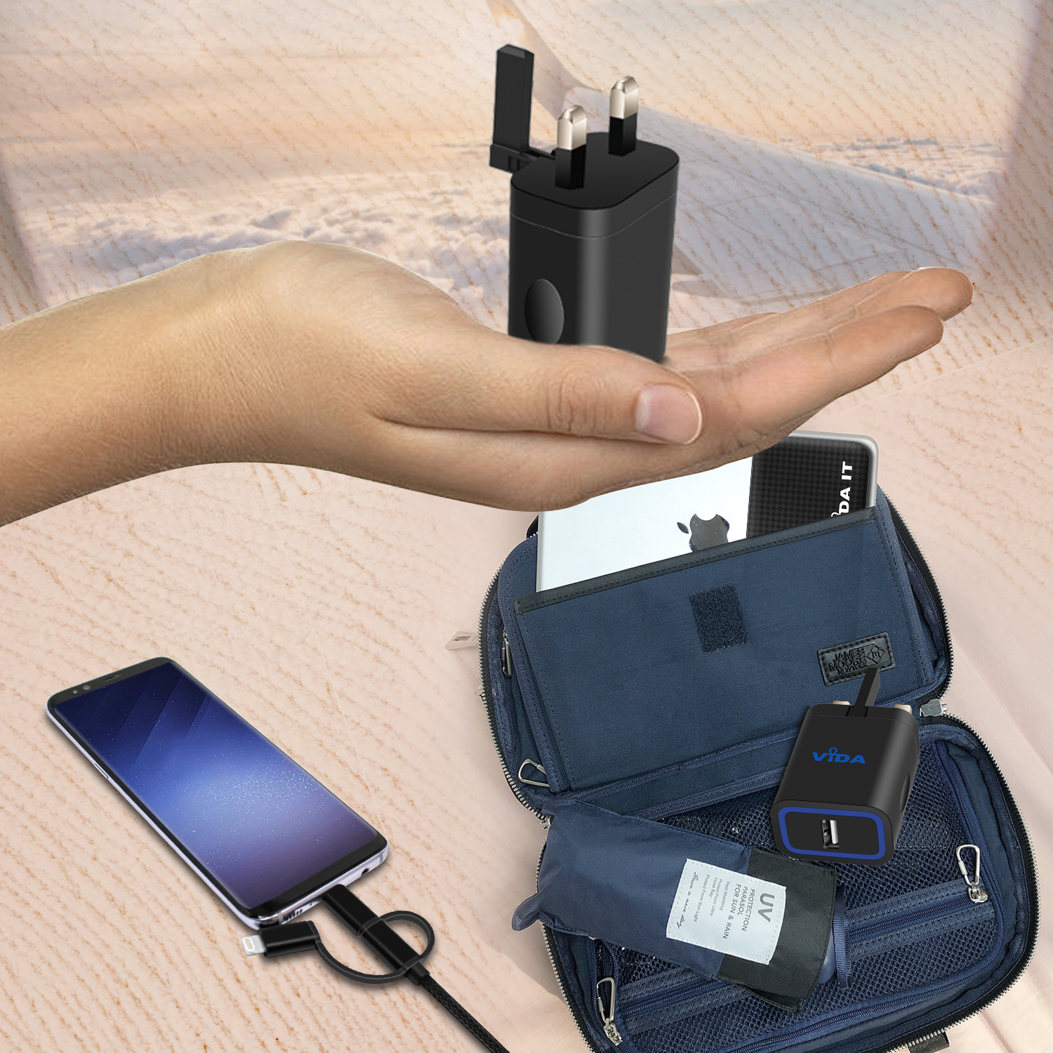 The newest in Vida IT’s power solutions, the V1 UK Compact travel charger for mobile phones. This uniquely designed charger is compact and rugged. It has a collapsible earth pin which folds into the charger for easy storage. The V1 charger is a high quality charger with CE/RoHS certificates.