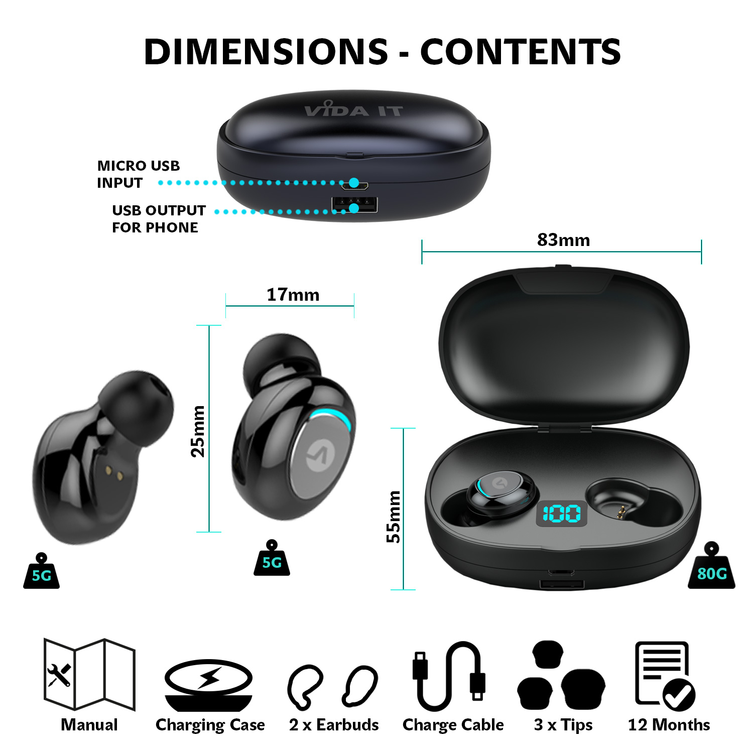[vc_row][vc_column width="1/6"][/vc_column][vc_column width="2/3"][vc_row_inner][vc_column_inner][vc_empty_space responsive_js_composer_custom_id="responsive_js_composer_custom_css_161911000"][cize_title style="style-01" title="Vida IT vBuds True Wireless Stereo Bluetooth Earbuds" desc="Vida IT vBuds next generation true wireless earphones offer complete wire free music streaming and voice calls. vBuds use the latest Bluetooth 5.0 technology coupled with a high-quality chipset to offer a stable connection between both earphones. Stream HD stereo sound flawlessly without interruptions." title_custom_id="cize_custom_css_532885078" responsive_js_composer_custom_id="responsive_js_composer_custom_css_1181879523"][vc_empty_space responsive_js_composer_custom_id="responsive_js_composer_custom_css_525118234"][vc_single_image image="14033" img_size="full" alignment="center" responsive_js_composer_custom_id="responsive_js_composer_custom_css_1721466485"][vc_empty_space height="16px" responsive_js_composer_custom_id="responsive_js_composer_custom_css_356287639"][vc_single_image image="14038" img_size="full" alignment="center" responsive_js_composer_custom_id="responsive_js_composer_custom_css_191709349"][vc_empty_space height="16px" responsive_js_composer_custom_id="responsive_js_composer_custom_css_2009851860"][/vc_column_inner][/vc_row_inner][vc_row_inner][vc_column_inner width="1/3"][vc_single_image image="14023" img_size="full" alignment="center" css_animation="zoomIn" responsive_js_composer_custom_id="responsive_js_composer_custom_css_1472242429"][vc_empty_space height="20px" responsive_js_composer_custom_id="responsive_js_composer_custom_css_2087083253"][cize_title style="style-01" title="70 Hours Playtime" desc="Up to 20x recharging with the power bank case gives you a massive 70 hours of playtime. Unlike other models, vBuds don't just last a day, they will last you the whole week." title_custom_id="cize_custom_css_530635961" responsive_js_composer_custom_id="responsive_js_composer_custom_css_475875039"][vc_empty_space height="20px" responsive_js_composer_custom_id="responsive_js_composer_custom_css_961619569"][/vc_column_inner][vc_column_inner width="1/3"][vc_single_image image="14028" img_size="full" alignment="center" css_animation="zoomIn" responsive_js_composer_custom_id="responsive_js_composer_custom_css_1044789157"][vc_empty_space height="20px" responsive_js_composer_custom_id="responsive_js_composer_custom_css_1733909131"][cize_title style="style-01" title="HD Stereo Sound" desc="The latest 5.0 chipset provides immersive HD quality sound, giving you the ultimate experience. Featuring both CVC echo and noise-cancelling technology to drown out background sound." title_custom_id="cize_custom_css_1979839251" responsive_js_composer_custom_id="responsive_js_composer_custom_css_1186714758"][vc_empty_space height="20px" responsive_js_composer_custom_id="responsive_js_composer_custom_css_522510577"][/vc_column_inner][vc_column_inner width="1/3"][vc_single_image image="14043" img_size="full" alignment="center" css_animation="zoomIn" responsive_js_composer_custom_id="responsive_js_composer_custom_css_1329978899"][vc_empty_space height="20px" responsive_js_composer_custom_id="responsive_js_composer_custom_css_248081865"][cize_title style="style-01" title="Portable Charger" desc="vBuds come with a massive 2200mAh charging case to ensure the longest possible charge. It features an output USB port that allows you to charge your phone directly from the case." title_custom_id="cize_custom_css_2068388177" responsive_js_composer_custom_id="responsive_js_composer_custom_css_673824749"][vc_empty_space height="20px" responsive_js_composer_custom_id="responsive_js_composer_custom_css_1241256511"][/vc_column_inner][/vc_row_inner][vc_row_inner][vc_column_inner width="1/3"][vc_single_image image="14048" img_size="full" alignment="center" css_animation="zoomIn" responsive_js_composer_custom_id="responsive_js_composer_custom_css_629007289"][vc_empty_space height="20px" responsive_js_composer_custom_id="responsive_js_composer_custom_css_1951021860"][cize_title style="style-01" title="Auto Pairing Function" desc="Pick and play with our auto-pairing technology means the earbuds will auto-connect to each other. You just remove it from the case, connect it to your phone and you're ready to start streaming." title_custom_id="cize_custom_css_875374656" responsive_js_composer_custom_id="responsive_js_composer_custom_css_577558243"][vc_empty_space height="40px" responsive_js_composer_custom_id="responsive_js_composer_custom_css_1963448569"][/vc_column_inner][vc_column_inner width="1/3"][vc_single_image image="14053" img_size="full" alignment="center" css_animation="zoomIn" responsive_js_composer_custom_id="responsive_js_composer_custom_css_1427468822"][vc_empty_space height="20px" responsive_js_composer_custom_id="responsive_js_composer_custom_css_856419026"][cize_title style="style-01" title="Power LED Display" desc="Always know when you're running low on power with the case LED power display. Let you know when the case is running low and time to recharge." title_custom_id="cize_custom_css_972191040" responsive_js_composer_custom_id="responsive_js_composer_custom_css_1607043567"][vc_empty_space height="40px" responsive_js_composer_custom_id="responsive_js_composer_custom_css_900054585"][/vc_column_inner][vc_column_inner width="1/3"][vc_single_image image="14058" img_size="full" alignment="center" css_animation="zoomIn" responsive_js_composer_custom_id="responsive_js_composer_custom_css_477426382"][vc_empty_space height="20px" responsive_js_composer_custom_id="responsive_js_composer_custom_css_1458058170"][cize_title style="style-01" title="Fits Every Ear" desc="vBuds come with 3 different size earbuds to ensure a comfortable fit in any size ear. For best performance choose the correct size earpiece for your ear canal size." title_custom_id="cize_custom_css_1193324876" responsive_js_composer_custom_id="responsive_js_com