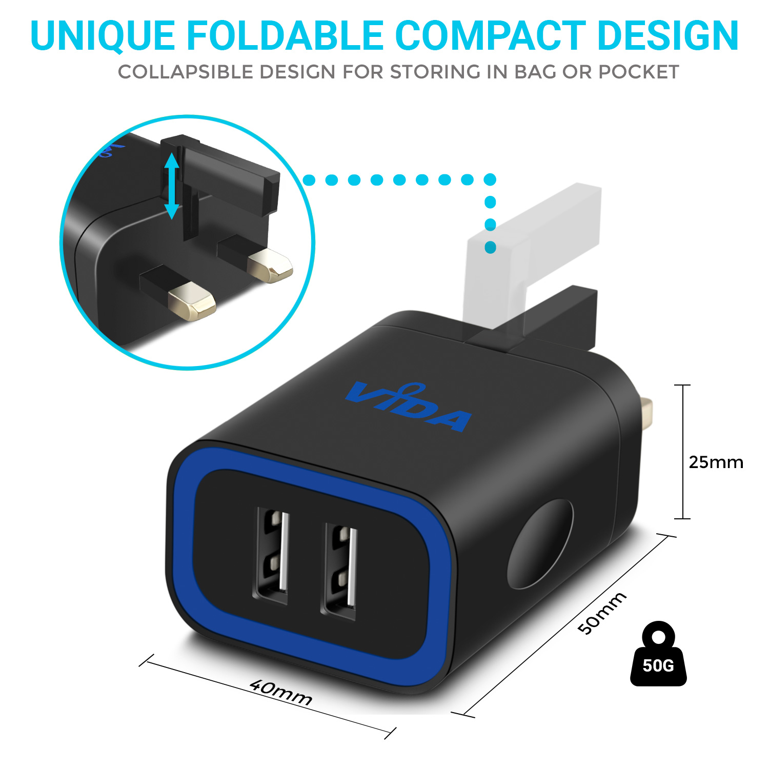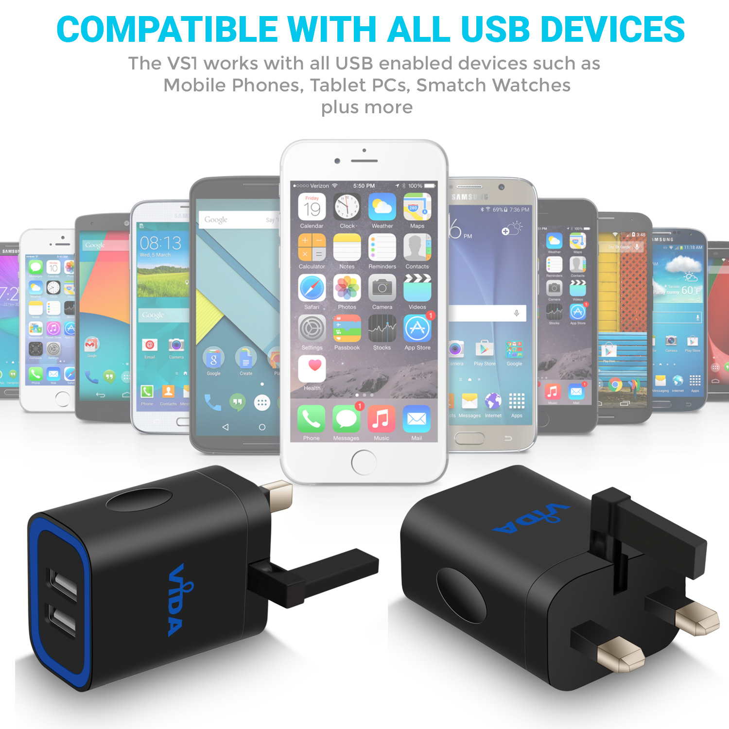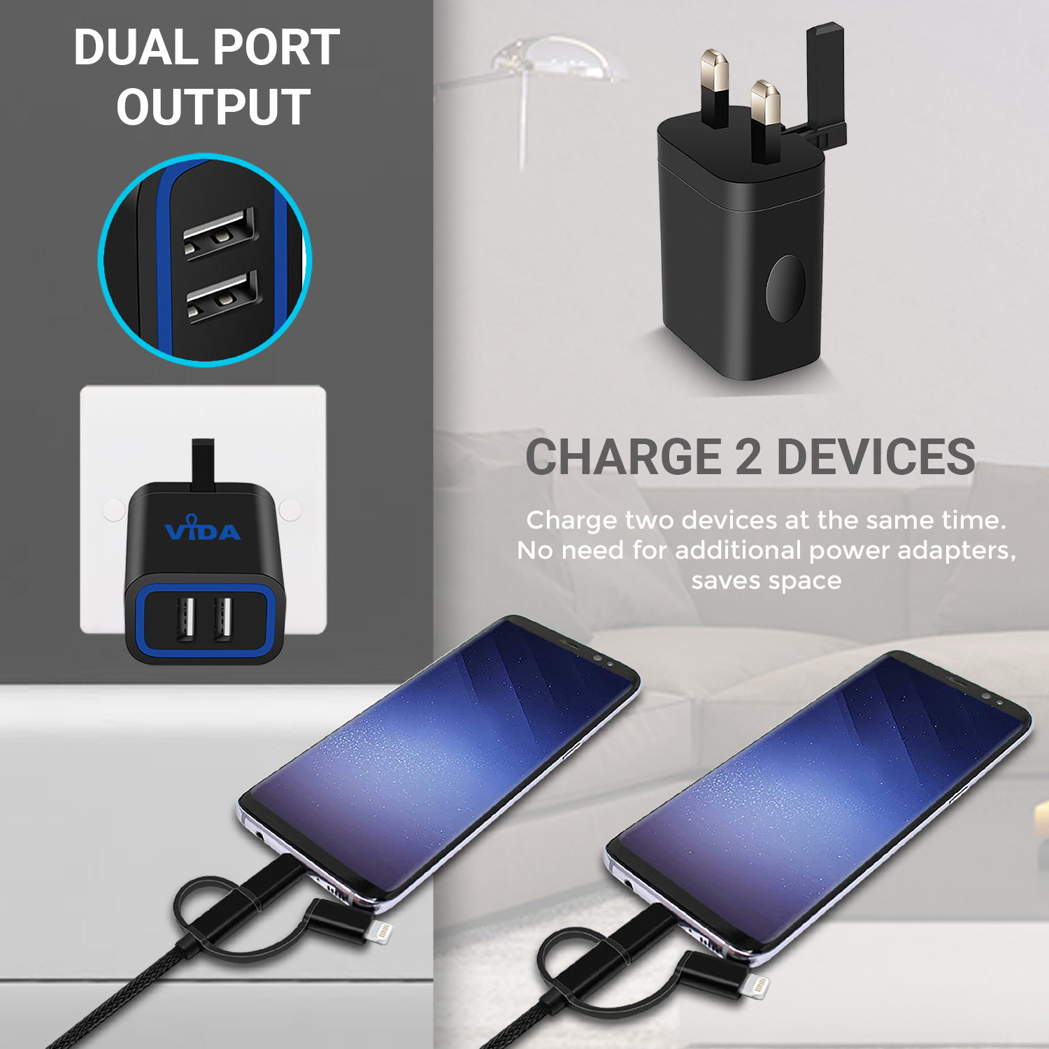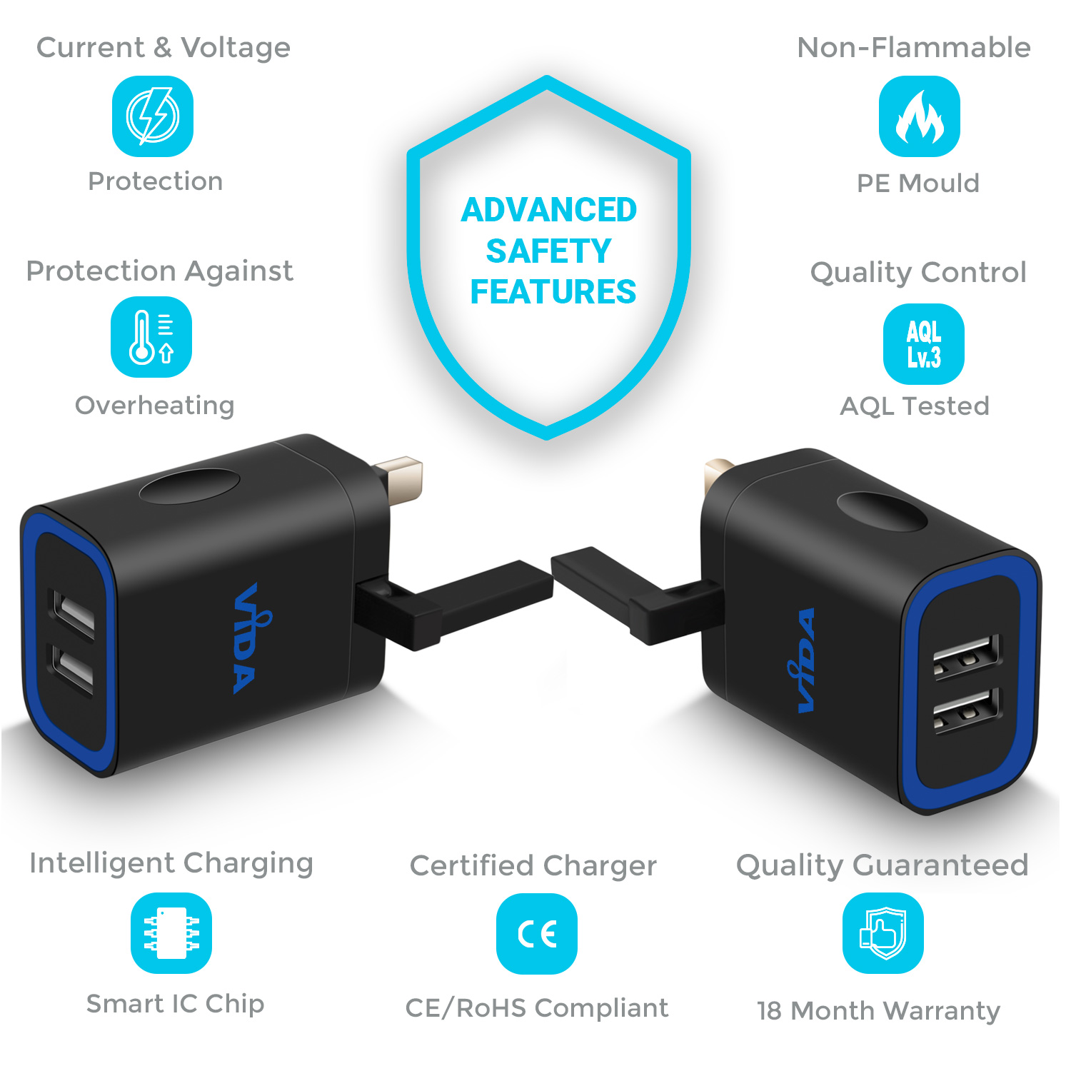 [vc_row][vc_column][vc_single_image image="1330" img_size="large" alignment="center" responsive_js_composer_custom_id="responsive_js_composer_custom_css_1132091845"][vc_empty_space responsive_js_composer_custom_id="responsive_js_composer_custom_css_726235182"][vc_empty_space responsive_js_composer_custom_id="responsive_js_composer_custom_css_228589915"][vc_separator responsive_js_composer_custom_id="responsive_js_composer_custom_css_1454102683"][/vc_column][/vc_row][vc_row][vc_column][vc_empty_space responsive_js_composer_custom_id="responsive_js_composer_custom_css_1488314598"][cize_title style="style-01" title="Vida IT VS1 Dual Port Charger" desc="The VS1 is the perfect charger for all your devices. The 12 watts through the 2.4A port lets you charge your phone and tablet or other devices that are USB-compatible. Complete with a high quality 3-in-1 universal nylon braided cable to charge all device types such as iPhone, iPad, Android Phones and Tablet PCs. Supports charging 2 devices at the same time." title_custom_id="cize_custom_css_1412574510" responsive_js_composer_custom_id="responsive_js_composer_custom_css_481602233"][vc_empty_space responsive_js_composer_custom_id="responsive_js_composer_custom_css_1939713500"][cize_title style="style-01" title="Intelligent Charging for your Mobile Phone" desc="The Vida IT VS1 2.4A USB UK Wall Charger features a smart integrated circuit which identifies the current and the voltage of your device so that it can charge it at the fastest speed safely. Ride the recharging expressway and get the maximum charging speed. Less time to charge, more time to play!" title_custom_id="cize_custom_css_1719085928" responsive_js_composer_custom_id="responsive_js_composer_custom_css_50469836"][vc_empty_space responsive_js_composer_custom_id="responsive_js_composer_custom_css_80830614"][cize_title style="style-01" title="Unique Compact Design and Build" desc="The design is also unique as compared to other chargers in the market. The Vida IT VS1 2 Port USB UK Wall Charger has a unique foldable third pin which allows users to enjoy a compact storage. If you travel a lot and would like to carry your charger along, this charger is small enough to fit into your small bag or pocket. The foldability of the pin means it won’t break easily as compared to your conventional charger. So it is the most ideal charger for family use." title_custom_id="cize_custom_css_224801402" responsive_js_composer_custom_id="responsive_js_composer_custom_css_763670854"][vc_empty_space responsive_js_composer_custom_id="responsive_js_composer_custom_css_1534452690"][cize_title style="style-01" title="Quality" desc="The quality of the Vida IT VS1 2.4A USB Dual UK Wall Charger with Smart IC 5V couldn't get any better. You get a high quality 21 AWG USB charging cable which has Micro USB, iPhone and USB-C adapters attached. This means you only need to carry one cable for all devices. All Vida IT chargers are AQL tested to ensure the highest quality. It comes with an 18-Month cover so you can be secure with after sales support." title_custom_id="cize_custom_css_2001443005" responsive_js_composer_custom_id="responsive_js_composer_custom_css_1580071491"][vc_empty_space responsive_js_composer_custom_id="responsive_js_composer_custom_css_1296675209"][cize_title style="style-01" title="Package Contents" desc="1 x VS1 2.4A USB Wall Charger UK Plug, 1 x USB 3-in-1 Cable (Micro USB, iPhone & USB-C Adapters), 1 x User Manual" title_custom_id="cize_custom_css_1612117656" responsive_js_composer_custom_id="responsive_js_composer_custom_css_200026241"][vc_empty_space responsive_js_composer_custom_id="responsive_js_composer_custom_css_846963757"][/vc_column][vc_column][vc_empty_space responsive_js_composer_custom_id="responsive_js_composer_custom_css_137531994"][vc_separator responsive_js_composer_custom_id="responsive_js_composer_custom_css_949437711"][/vc_column][/vc_row][vc_row][vc_column][cize_demo style="style-02" content_position="content-left" image="6246" title="Safety" demo_custom_id="cize_custom_css_1420274467" responsive_js_composer_custom_id="responsive_js_composer_custom_css_914025823"]The VS1 2 Port USB Wall Charger is designed using non-flammable material, it features over current and short circuit protection. Unlike cheaper mobile phone chargers on the market, the VS1 is safe to use, built using quality components. Manufactured to the highest standards, CE, RoHS and FCC certified charger.[/cize_demo][/vc_column][/vc_row][vc_row][vc_column][cize_demo style="style-02" image="6246" title="Speed" demo_custom_id="cize_custom_css_403123378" responsive_js_composer_custom_id="responsive_js_composer_custom_css_1868890557"]The VS1 mobile phone charger comes with an integrated smart IC which can identify the optimum voltage and current to supply to your smartphone or tablet PC. This ensures that your phone charges at the fastest speed possible. Super-fast charging with 2 ports to ensure you have room for two devices.[/cize_demo][/vc_column][/vc_row][vc_row][vc_column][cize_demo style="style-02" content_position="content-left" image="6272" title="Compact Design" demo_custom_id="cize_custom_css_422119186" responsive_js_composer_custom_id="responsive_js_composer_custom_css_1243724655"]A unique 3-Pin UK Plug design, comes with a third 3 pin which is collapsible and allows for compact storage. Easy to store in your bag with its foldable design. The VS1 is the best mobile phone adapter for your device. Two USB ports which allow you to charge two mobile phones or tablet PCs at the same time.[/cize_demo][/vc_column][/vc_row][vc_row][vc_column][cize_demo style="style-02" image="6278" title="Compatible" demo_custom_id="cize_custom_css_298891686" responsive_js_composer_custom_id="responsive_js_composer_custom_css_982149306"]The VS1 charger is compatible with all mobile phones and Tablet PCs, it comes with a free micro USB cable plus iPhone and Type-C adapters which can be used with Android phones, iPhones, iPads and 