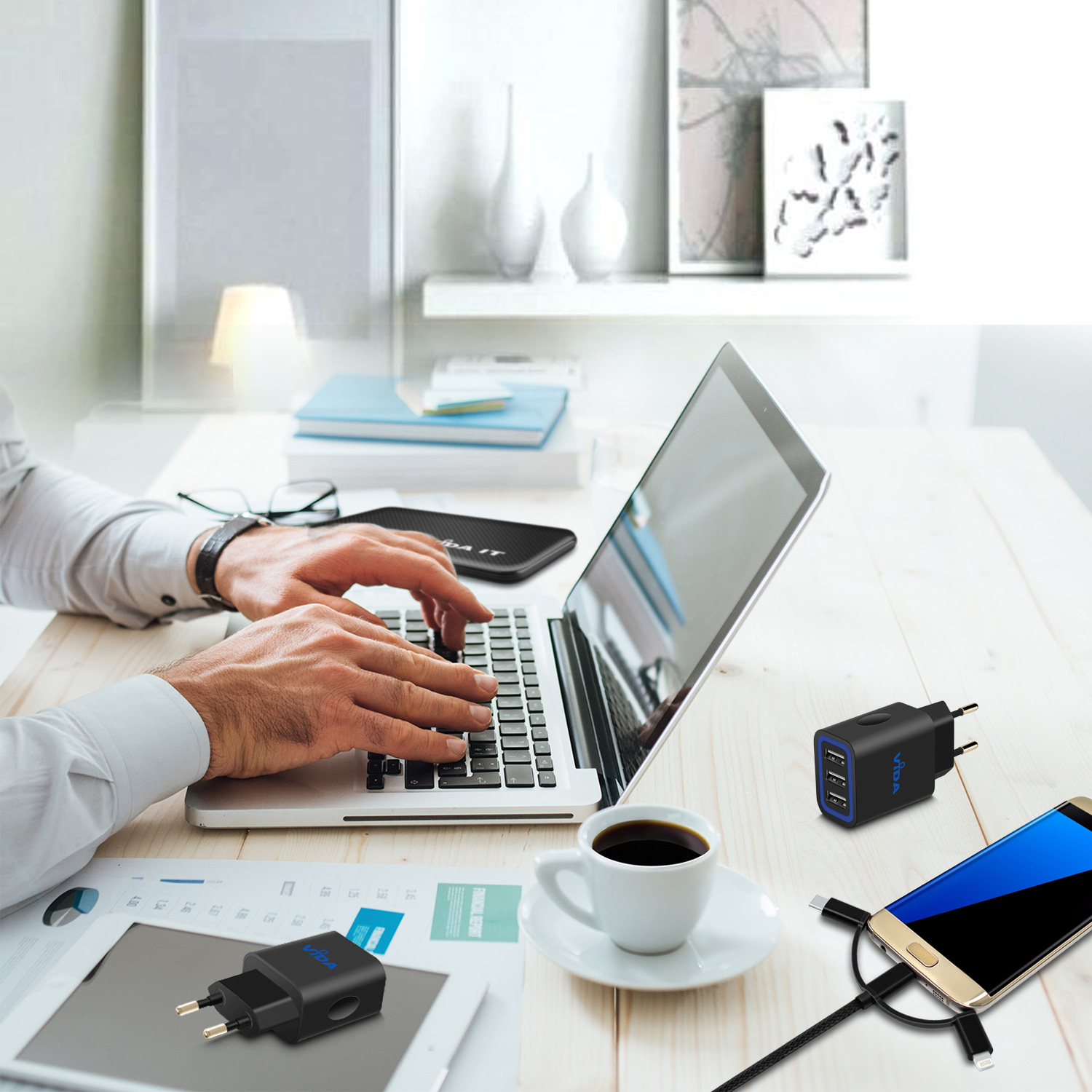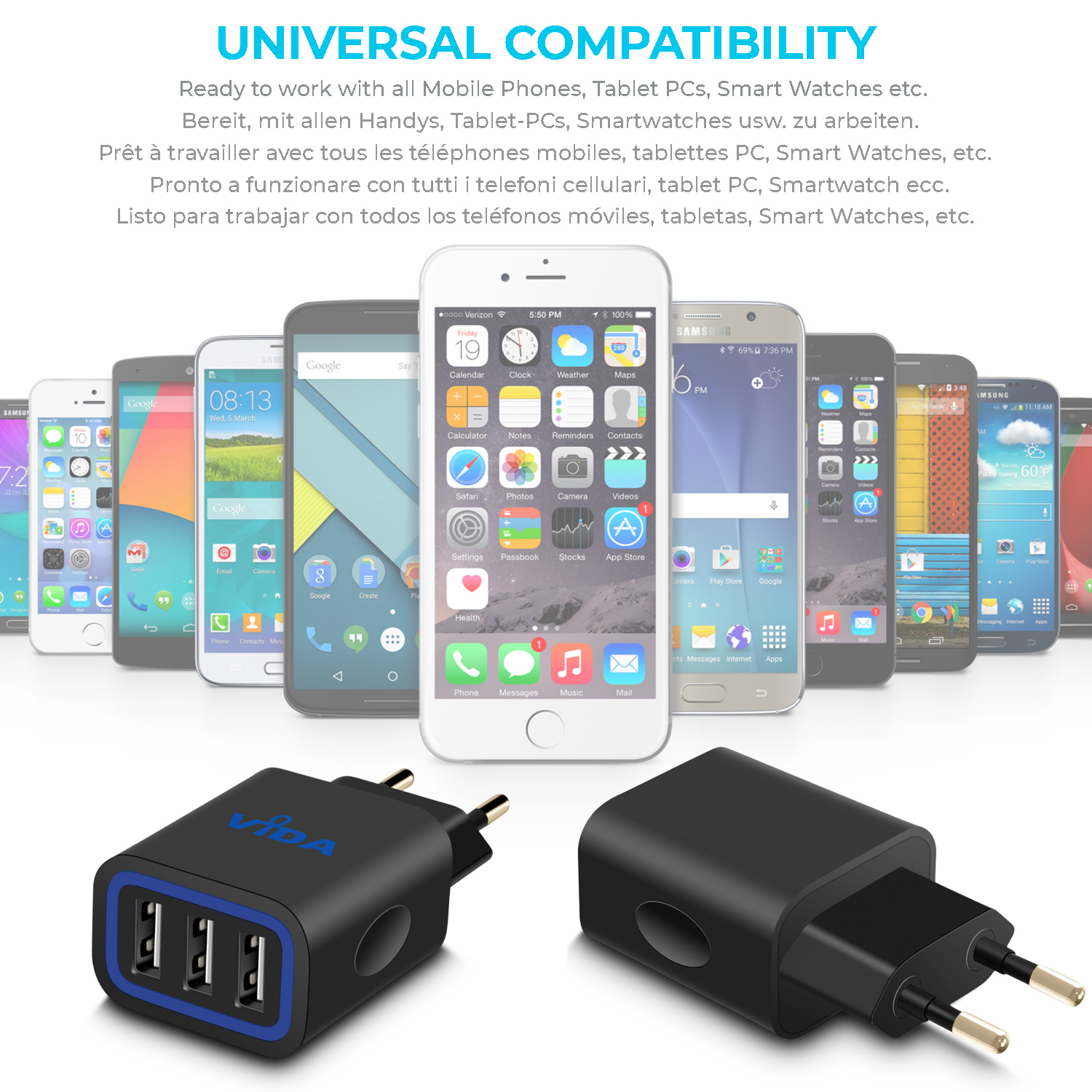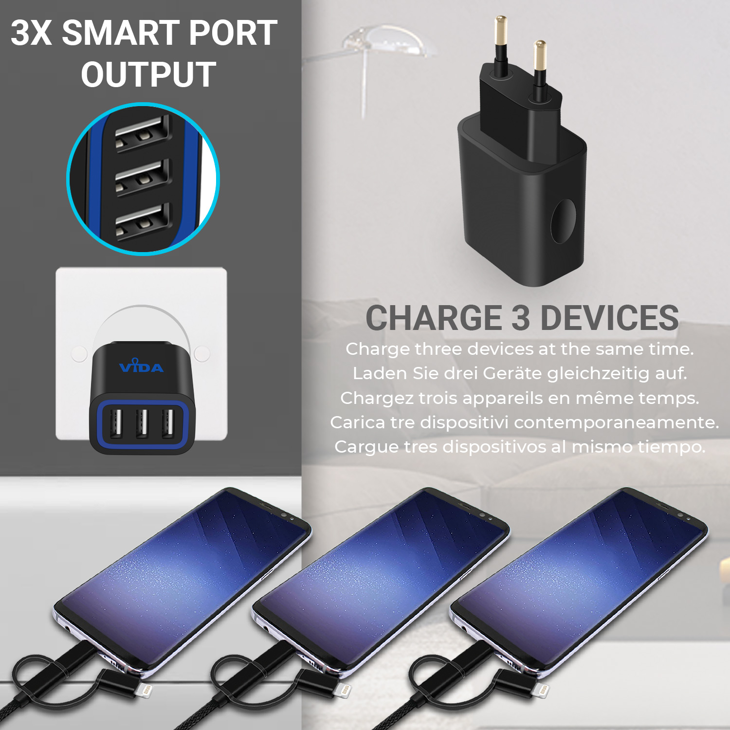 [vc_row][vc_column][vc_single_image image="1330" img_size="large" alignment="center" responsive_js_composer_custom_id="responsive_js_composer_custom_css_1800373996"][vc_empty_space responsive_js_composer_custom_id="responsive_js_composer_custom_css_1870790445"][vc_empty_space responsive_js_composer_custom_id="responsive_js_composer_custom_css_477719155"][vc_separator responsive_js_composer_custom_id="responsive_js_composer_custom_css_867154582"][/vc_column][/vc_row][vc_row][vc_column][vc_empty_space responsive_js_composer_custom_id="responsive_js_composer_custom_css_708449925"][cize_title style="style-01" title="Vida IT VS1 3 Port Charger" desc="The VS1 Charger has a 3 ports that allows you to charge 3 devices at the same time. The 15.5 watts through the 3 ports lets you charge your phone and tablet or other devices that are USB-compatible. A good charger for mobile phone should charge an iPad Air 2/1, iPhone 6, 6 Plus, Note 4, Nexus 6, 5, Samsung Galaxy S6 / S6 Edge or other USB Powered Mobile Devices and VS1 3 Port USB UK Wall Charger does that." title_custom_id="cize_custom_css_864478830" responsive_js_composer_custom_id="responsive_js_composer_custom_css_1286944871"][vc_empty_space responsive_js_composer_custom_id="responsive_js_composer_custom_css_1724579936"][cize_title style="style-01" title="Intelligent Charging for your Mobile Phone" desc="The Vida IT VS1 3 Port USB EU Wall Charger is popular due to the fact that you can charge three devices at the same time and faster than your conventional chargers. The smart integrated circuit in the VS1 3 port wall charger also identifies the current and the voltage of your device so that it can charge it safely. Ride the recharging expressway and get the maximum charging speed." title_custom_id="cize_custom_css_1336993023" responsive_js_composer_custom_id="responsive_js_composer_custom_css_274100042"][vc_empty_space responsive_js_composer_custom_id="responsive_js_composer_custom_css_764198633"][cize_title style="style-01" title="Unique Compact Design and Build" desc="The design is also unique as compared to other chargers in the market. The Vida IT VS1 3 Port USB EU Wall Charger has a unique slim design which allows users to enjoy a compact storage. If you travel a lot and would like to carry your charger along, this charger is small enough to fit into your small bag or pocket. The lightweight and slim design means it won’t break easily as compared to your conventional charger. So it is the most ideal charger for family use." title_custom_id="cize_custom_css_912734686" responsive_js_composer_custom_id="responsive_js_composer_custom_css_413709215"][vc_empty_space responsive_js_composer_custom_id="responsive_js_composer_custom_css_743284240"][cize_title style="style-01" title="Quality" desc="The quality of the Vida IT VS1 3 Port USB EU Wall Charger with Smart IC 5V 3.1A couldn’t get any better. You get a high quality 24AWG Micro USB charging cable with additional iPhone-lightning and Type-C adapters. So if you are looking for the most ideal charger for all your android phones or other USB-compatible devices then this is what you should have." title_custom_id="cize_custom_css_1446371518" responsive_js_composer_custom_id="responsive_js_composer_custom_css_52514515"][vc_empty_space responsive_js_composer_custom_id="responsive_js_composer_custom_css_1096438942"][cize_title style="style-01" title="Package Contents" desc="VS1 3-Ports USB Wall Charger - European 2-pin Plug, Micro USB charging cable, 2 x Additional adapters for iPhone and Type-C connectors, User Manual" title_custom_id="cize_custom_css_265787972" responsive_js_composer_custom_id="responsive_js_composer_custom_css_791740606"][vc_empty_space responsive_js_composer_custom_id="responsive_js_composer_custom_css_1737186826"][/vc_column][vc_column][vc_empty_space responsive_js_composer_custom_id="responsive_js_composer_custom_css_485926212"][vc_separator responsive_js_composer_custom_id="responsive_js_composer_custom_css_1416064904"][/vc_column][/vc_row][vc_row][vc_column][cize_demo style="style-02" content_position="content-left" image="6246" title="Safety" demo_custom_id="cize_custom_css_136089138" responsive_js_composer_custom_id="responsive_js_composer_custom_css_1413614720"]The VS1 3 Port USB Wall Charger is designed using non-flammable material, it features over current and short circuit protection. Unlike cheaper mobile phone chargers on the market, the VS1 is safe to use, built using quality components. Manufactured to the highest standards, CE, RoHS and FCC certified charger.[/cize_demo][/vc_column][/vc_row][vc_row][vc_column][cize_demo style="style-02" image="6246" title="Speed" demo_custom_id="cize_custom_css_288761358" responsive_js_composer_custom_id="responsive_js_composer_custom_css_2130914453"]The VS1 mobile phone charger comes with an integrated smart IC which can identify the optimum voltage and current to supply to your smartphone or tablet PC. This ensures that your phone charges at the fastest speed possible. Super-fast charging with 3 ports to ensure you have room for three devices.[/cize_demo][/vc_column][/vc_row][vc_row][vc_column][cize_demo style="style-02" content_position="content-left" image="6272" title="Compact Design" demo_custom_id="cize_custom_css_520301264" responsive_js_composer_custom_id="responsive_js_composer_custom_css_169769459"]A unique 2-Pin EU Plug design. Easy to store in your bag. The VS1 is the best mobile phone adapter for your device. Three USB ports which allow you to charge three mobile phones or tablet PCs at the same time.[/cize_demo][/vc_column][/vc_row][vc_row][vc_column][cize_demo style="style-02" image="6278" title="Compatible" demo_custom_id="cize_custom_css_848263754" responsive_js_composer_custom_id="responsive_js_composer_custom_css_651139309"]The VS1 charger is compatible with all mobile phones and Tablet PCs, it comes with a free micro USB cable which can be used with most Android phones (Note: iPhone and Micro USB Type C use